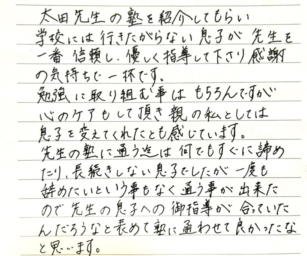 先生の塾に通う迄は何でもすぐに諦めたり、長続きしない息子でしたが、一度も辞めたいという事もなく通う事が出来たので、先生の息子への御指導が合っていたんだろうなと、改めて塾に通わせて良かったなと思います。