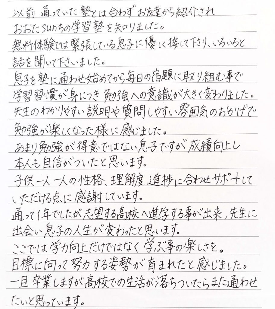 子ども一人ひとりの性格、理解度、進歩に合わせてサポートしていただける点に感謝しています。通って1年でしたが志望する高校へ進学することができ、先生に出会い息子の人生が変わったと思います。