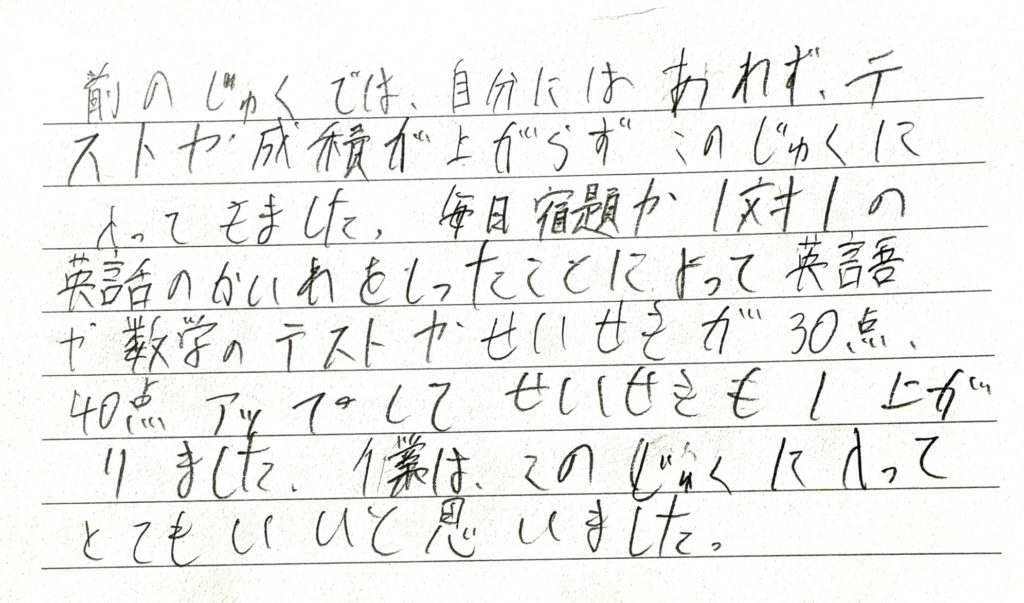 毎日宿題や1対1の英語の会話を知ったことによって英語や数学のテストや成績が30点40点アップして、成績も1上がりました。僕はこの塾に入ってとてもいいと思いました。