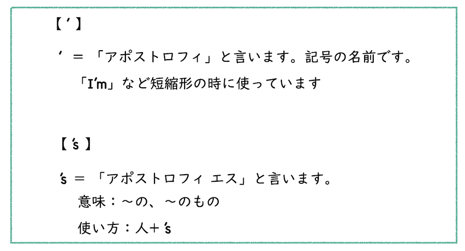 アポストロフィ(’)は記号の名前です。今までも使ってきています。例えば I’m He’s She’s It’sなど、短縮形にする時に書いていました。