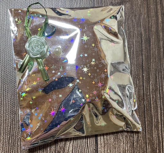 袋の角度を変えるとキラキラ光るんです。それに立体のシール。