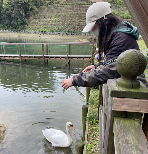 今回は筑紫公民館で行う予定でしたが、「白鳥の雛が産まれた」「今しか見ることができない」ということで急遽予定を変更して、日本経済大学さんへ行くことになりました。