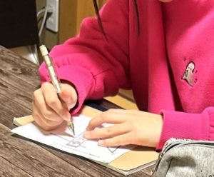 図付きの説明の紙を見た後、生徒さんが理解できたら、1問だけ問題が書いてある紙を渡し、それができたら問題の紙をもう1枚渡していきます。 一歩ずつ着実に理解できるまで問題をやっていきます。紙はわからなくなった時に見れるように、ノートに貼っていきます。