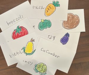 恥ずかしがり屋さんの小学2年性の生徒さんがなかなか大きな声を出して練習することができないので、手作りの英語カードを作成しました。下手な絵と字ですが愛情はたっぷり。喜んでくれるといいな。