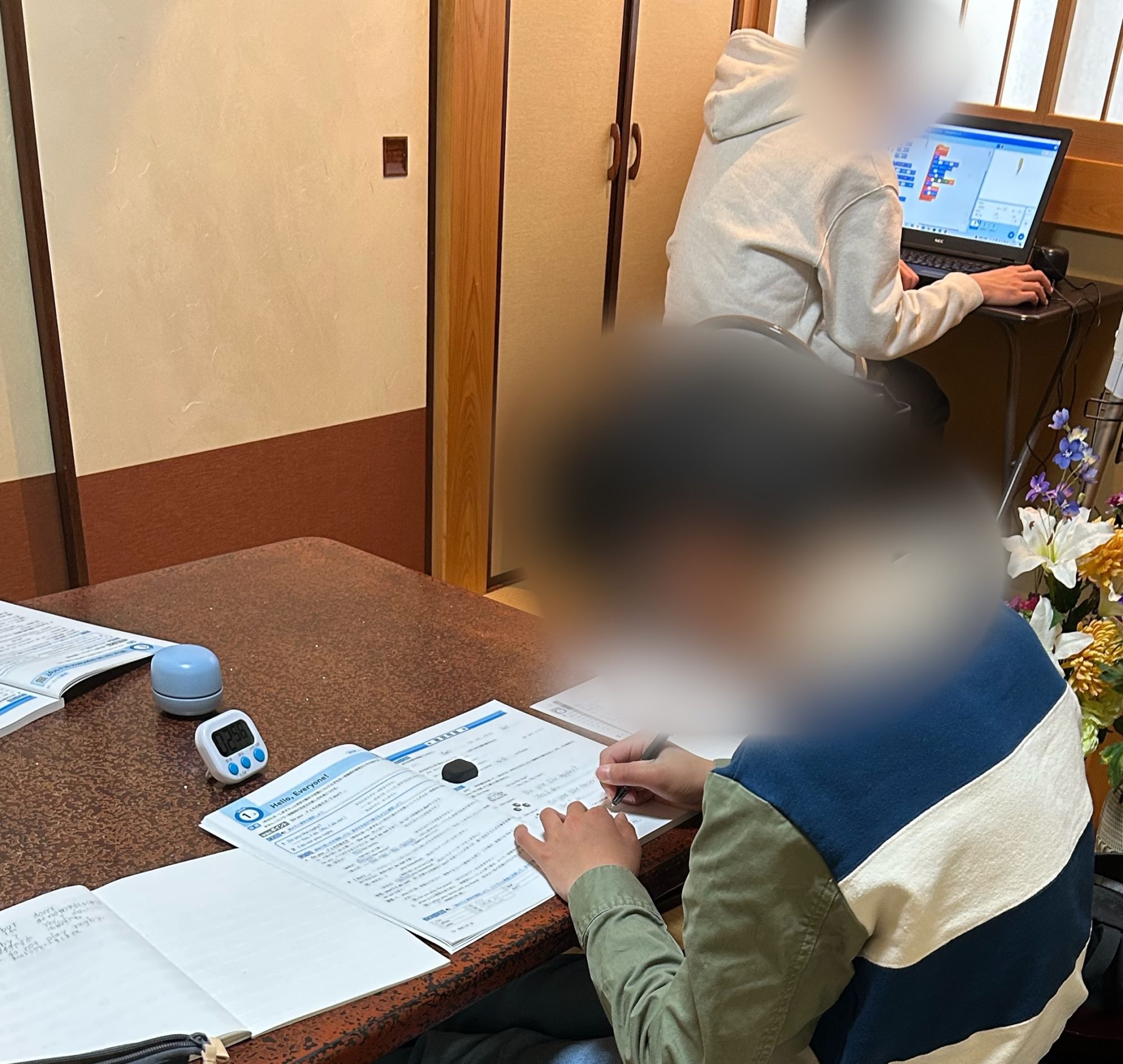 写真では、奥の生徒さんがパソコンでプログラミング(Scratch)に取り組み、手前の生徒さんは英語のワークに集中しています。