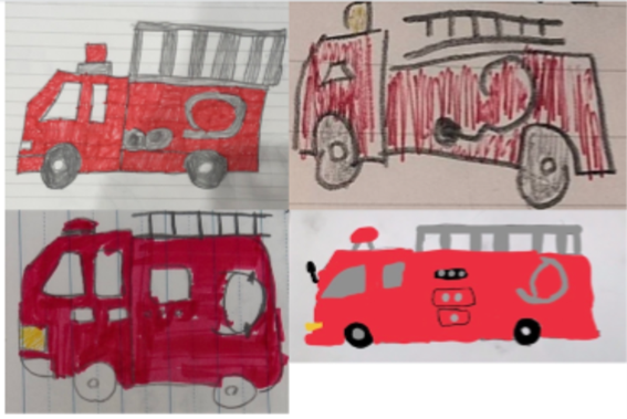記事の内容にちなんで、消防車の絵を描く問題も出題。
