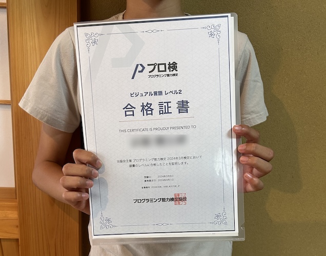 中学1年生の塾生さんが、プログラミング能力検定レベル2に合格しました! 塾生さんは、週1回30分ぐらい、プログラミングの授業を受けてくれています。合格証書を渡すと照れくさそうに受け取ってくれました。何度も合格証書を見ていたので、実際は相当... -